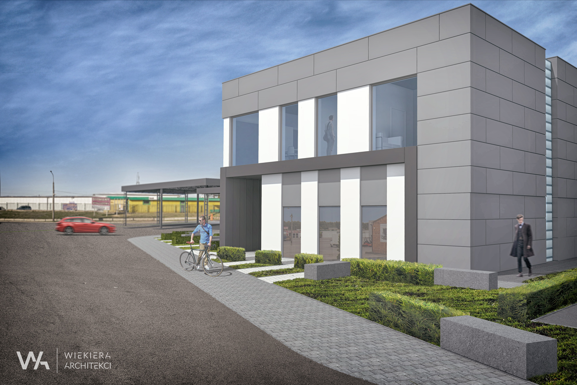 Projekt zakłada przebudowę i rozbudowę istniejącego, zdekapitalizowanego budynku administracyjnego Giełdy Kaliskiej. Obiekt mieści się w eksponowanej części terenu, bezpośrednio w strefie wjazdowej. Jego położenie determinuje do stworzenia budynku o wysokiej jakości estetyczno-funkcjonalnej. Budynek prosty w swojej formie ze współczesnym detalem i wysokiej jakości materiałami elewacyjnymi tworzy nową wartość architektoniczną na terenie giełdy. W strefie wejściowej zaprojektowano niewielki plac reprezentacyjny, powiązany kompozycyjnie z elewacją budynku.